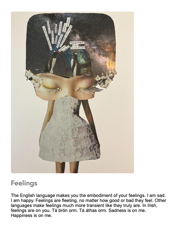 Here’s a snippet of some Irish in my collage book. I do love this about the Irish language and how you talk about feelings in it.