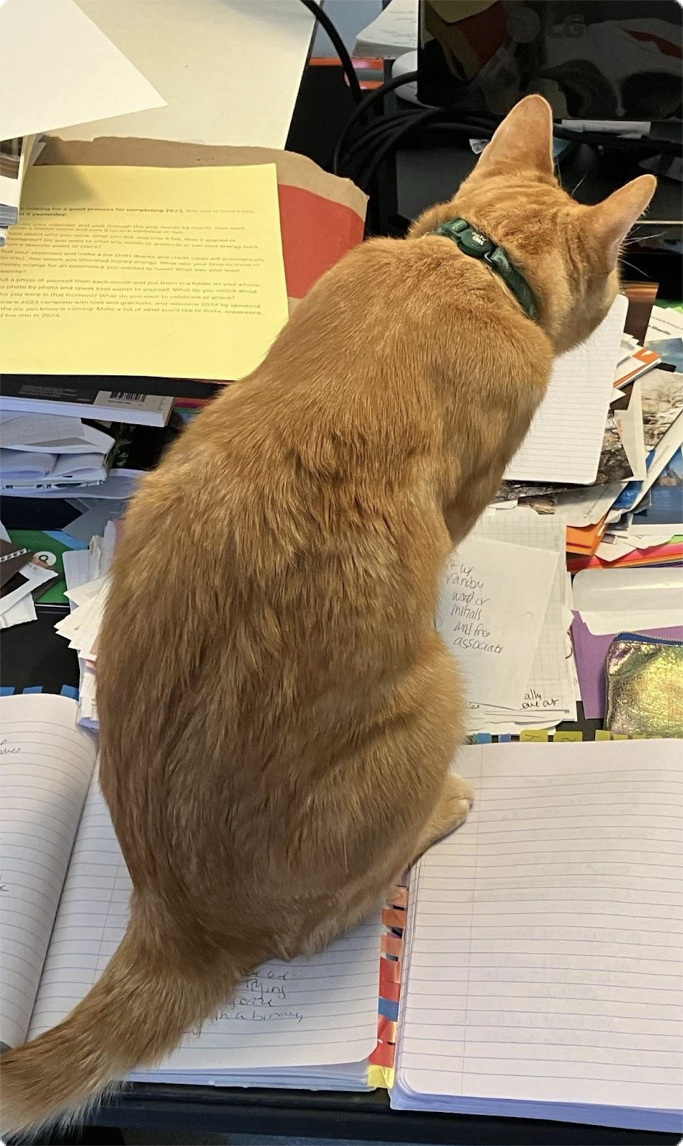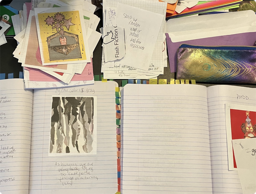 My original intent was to use up my art supplies—paper, glue, and art markers—that’s it—no more significant intent. I made “bad” art or whatever came out. But then I started to like the things I was making, and I felt like writing about them and what feelings they brought up. Again, without some larger agenda, I wanted to use up pens and notebooks.